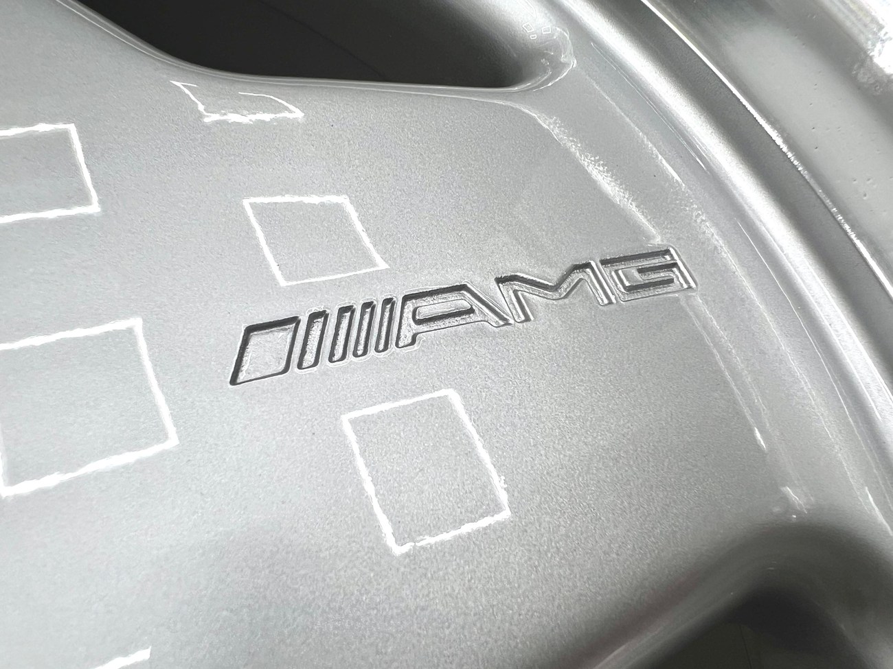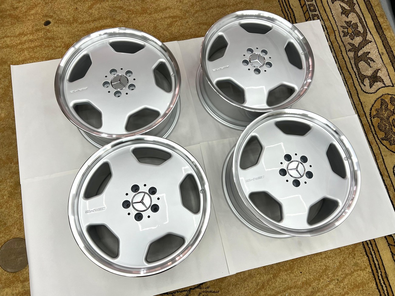 Each wheel has undergone comprehensive professional refinishing including surface preparation, precision color matching to original AMG silver, and lip polishing. Close-up photography available in gallery shows flawless finish with no curb rash, bends, or structural issues. All wheels are true and ready for immediate installation.