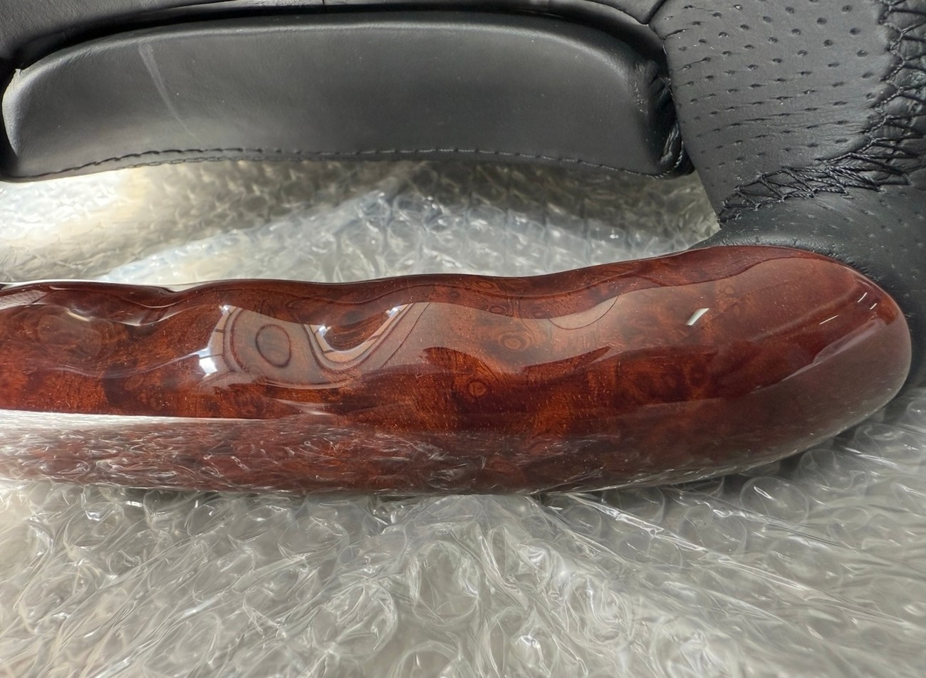 Crafted as an upgraded alternative to the original factory wheel, this piece offers a blend of OEM fitment with a contemporary sport-luxury feel. The seller states the wheel is in excellent condition with clean leather and wood surfaces and no cracks, scratches, or discoloration.